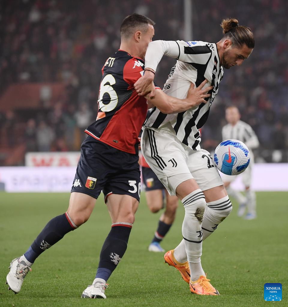 FC Juventus' Adrien Rabiot (R) vies with Genoa's Silvan Hefti during a Serie A football match between Genoa and FC Juventus in Genova, Italy, on May 6, 2022. (Str/Xinhua)