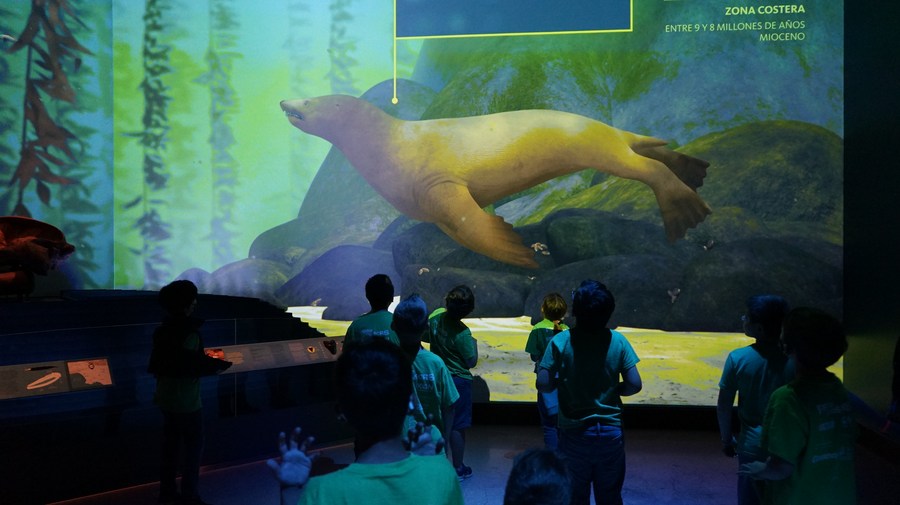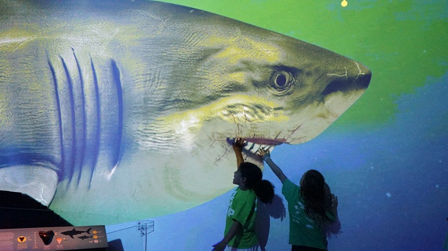 People visit "L.A. Underwater" exhibition at the Natural History Museum in Los Angeles, the United States, on May 6, 2022. (Photo by Zeng Hui/Xinhua)