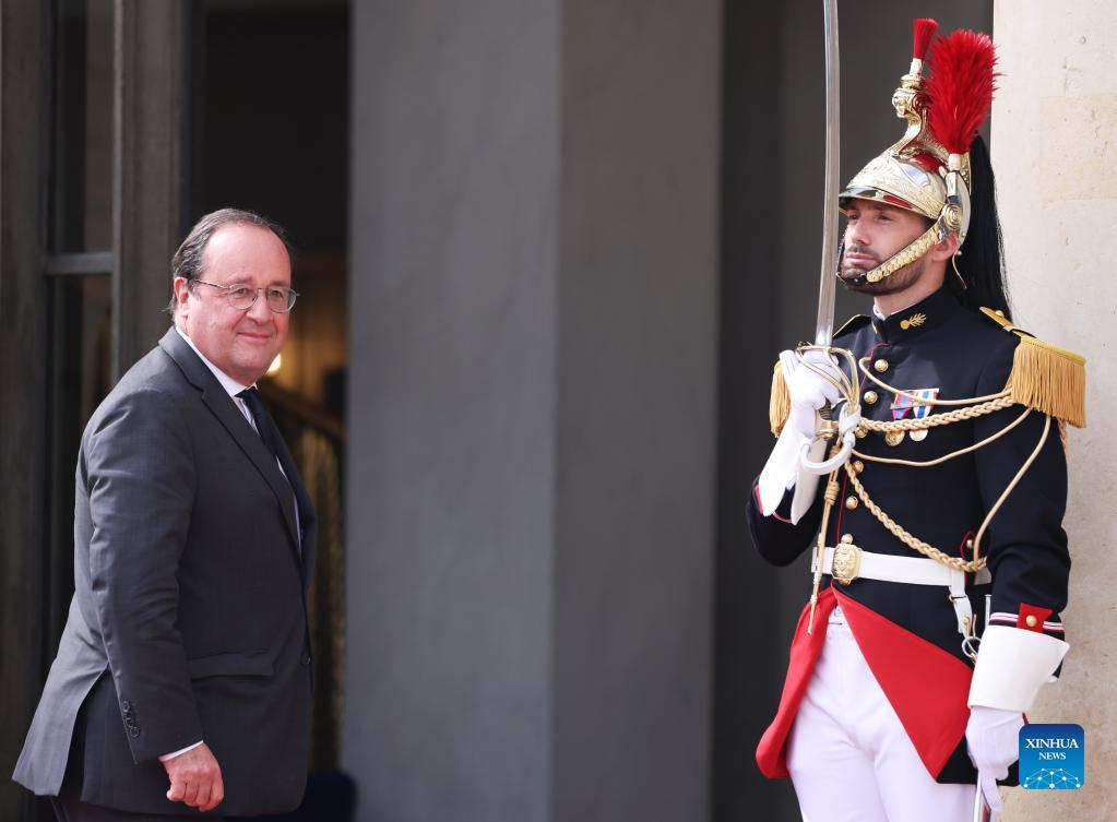 Former French President Francois Hollande arrives at the Elysee Palace to attend the investiture ceremony of Emmanuel Macron as French President in Paris, France, May 7, 2022. Macron won the second round of the election held on April 24 with an absolute majority of 18,768,638 votes (58.55 percent of the valid ballots cast). According to law, Macron's second term must begin no later than May 14. (Xinhua/Gao Jing)