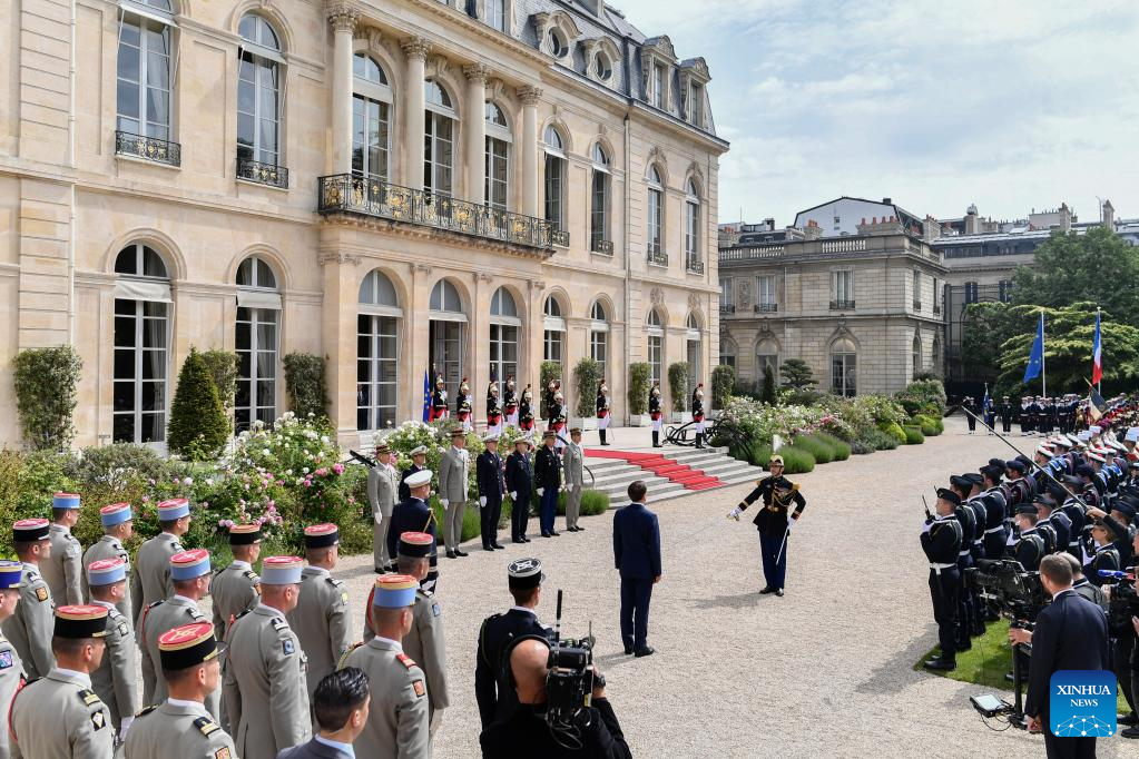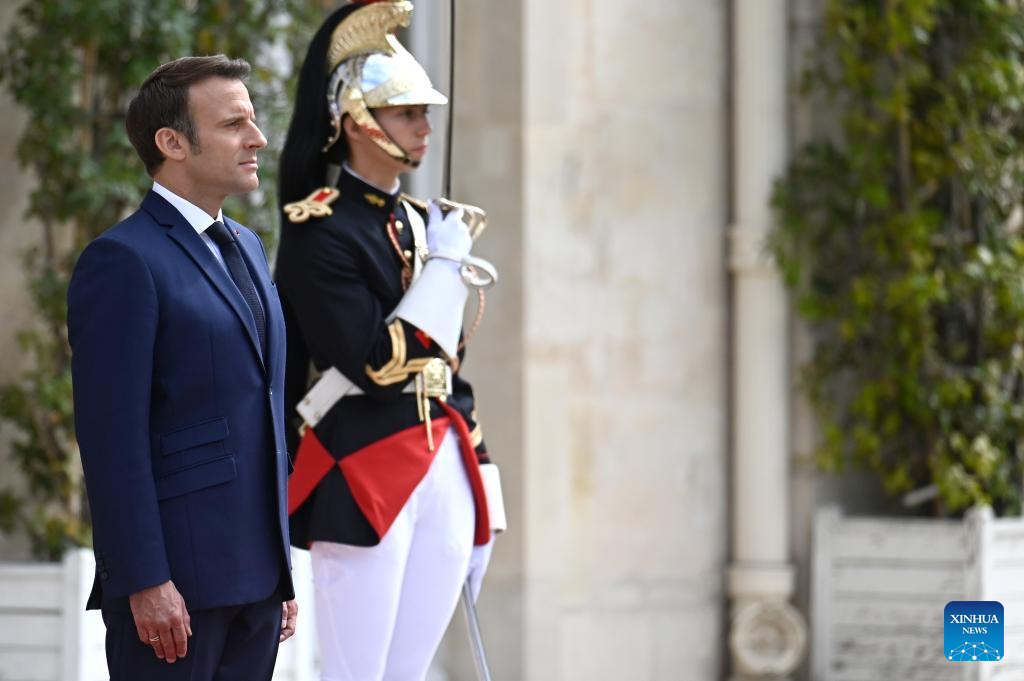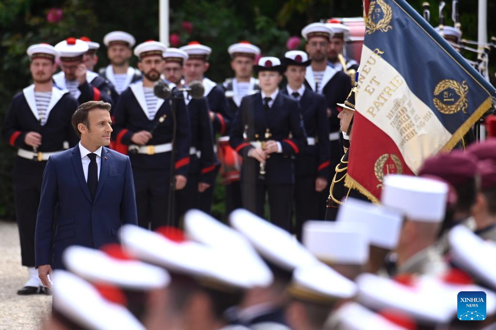French President Emmanuel Macron reviews the troops in the gardens of the Elysee Palace after the investiture ceremony in Paris, France, May 7, 2022. (Xinhua)