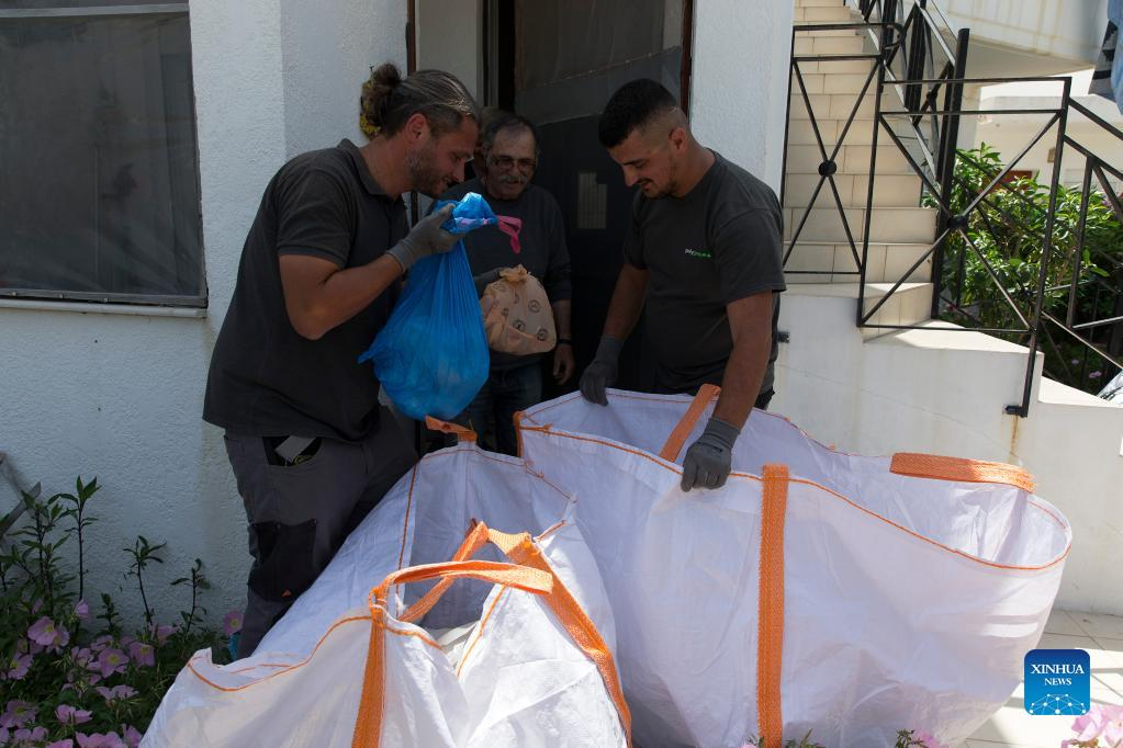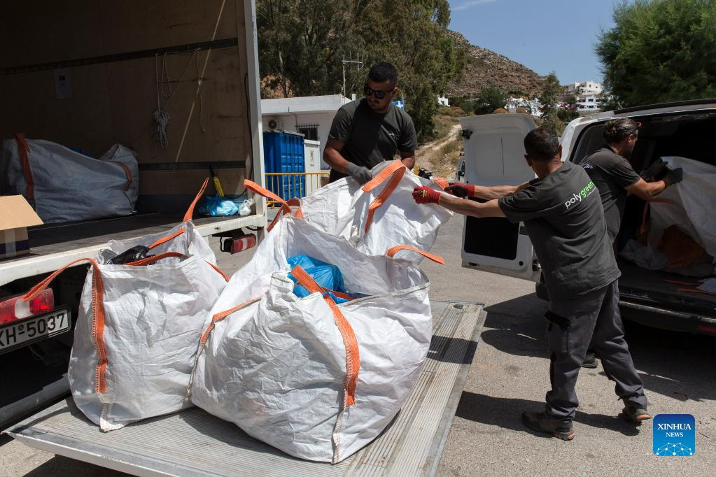 Employees of Tilos island municipality collect recycled waste on the island of Tilos, Greece, May 9, 2022. Tilos, a small island at the southeastern Aegean with over 500 residents, is the first island in Greece to rely entirely on renewable energy to meet its energy needs. After being self-sufficient in energy through wind and solar power, the island, with about 80 percent of its waste now recycled, also aims to become a "zero waste" island. (Photo by Marios Lolos/Xinhua)