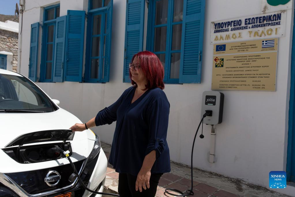 Maria Kamma Aliferi, mayor of Tilos island, charges an electric car on the island of Tilos, Greece, May 9, 2022. Tilos, a small island at the southeastern Aegean with over 500 residents, is the first island in Greece to rely entirely on renewable energy to meet its energy needs. After being self-sufficient in energy through wind and solar power, the island, with about 80 percent of its waste now recycled, also aims to become a "zero waste" island. (Photo by Marios Lolos/Xinhua)