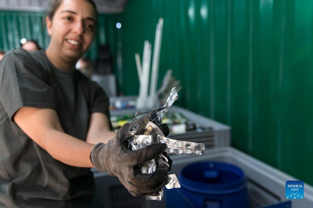 Employees of Tilos island municipality sort recycled waste at the recycling center of Tilos, Greece, May 9, 2022. Tilos, a small island at the southeastern Aegean with over 500 residents, is the first island in Greece to rely entirely on renewable energy to meet its energy needs. After being self-sufficient in energy through wind and solar power, the island, with about 80 percent of its waste now recycled, also aims to become a "zero waste" island. (Photo by Marios Lolos/Xinhua)