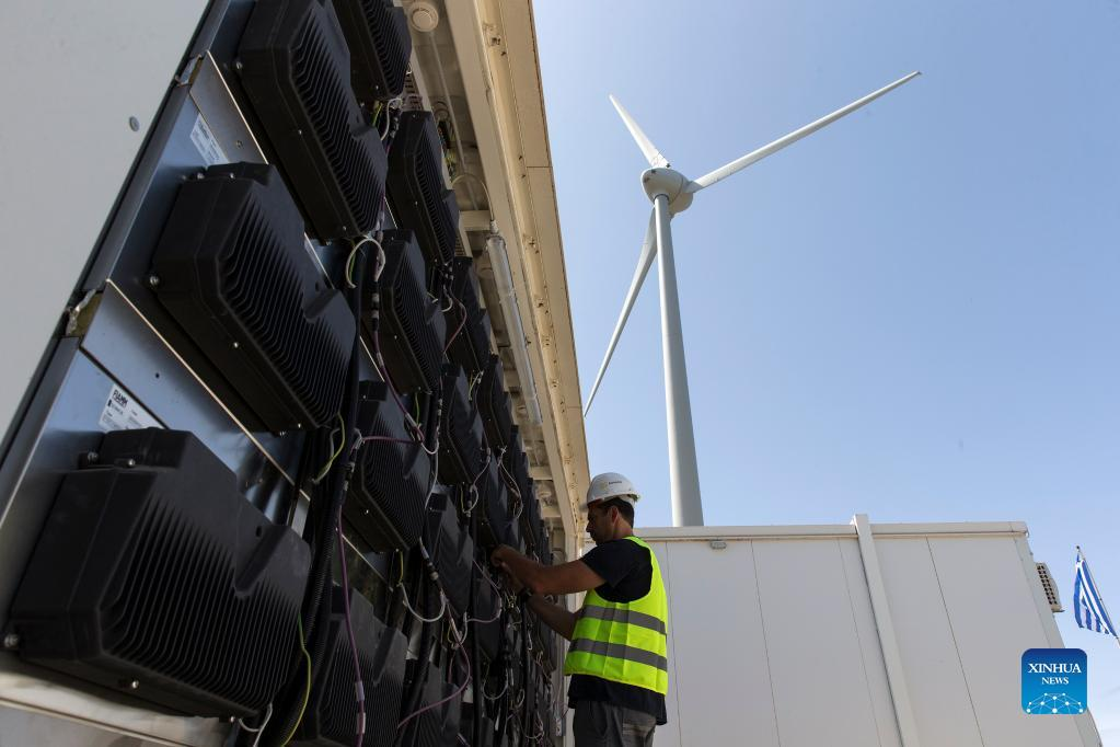 An employee works by the batteries of the energy storage system on the island of Tilos, Greece, May 9, 2022. Tilos, a small island at the southeastern Aegean with over 500 residents, is the first island in Greece to rely entirely on renewable energy to meet its energy needs. After being self-sufficient in energy through wind and solar power, the island, with about 80 percent of its waste now recycled, also aims to become a "zero waste" island. (Photo by Marios Lolos/Xinhua)