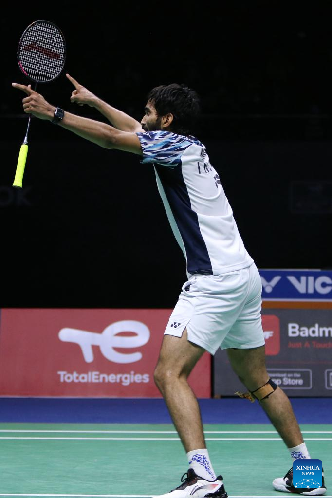 Kidambi Srikanth of India celebrates after the singles match against Jonatan Christie of Indonesia during the final match between Indonesia and India at Thomas Cup badminton tournament in Bangkok, Thailand, May 15, 2022. (Xinhua/Wang Teng)