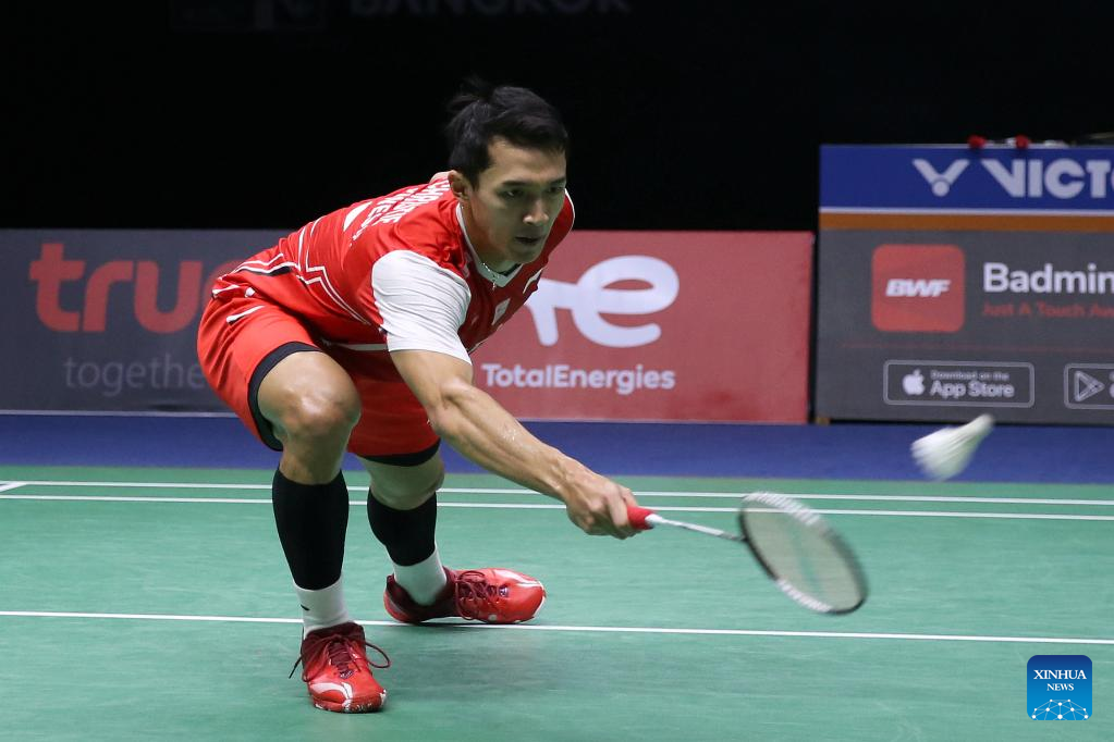 Jonatan Christie of Indonesia competes in the singles match against Kidambi Srikanth of India during the final match between Indonesia and India at Thomas Cup badminton tournament in Bangkok, Thailand, May 15, 2022. (Xinhua/Wang Teng)