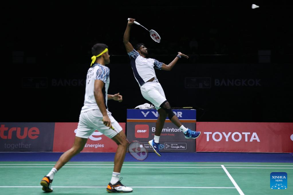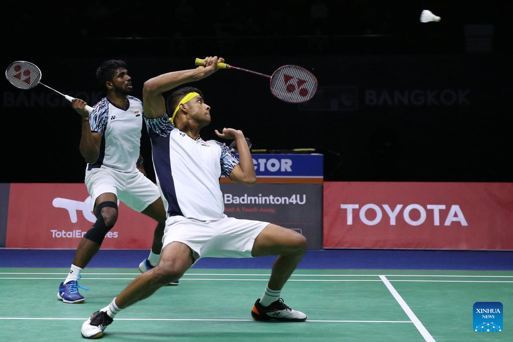 Satwiksairaj Rankireddy (L)/Chirag Shetty of India compete in the doubles match against Mohammad Ahsan/Kevin Sanjaya Sukamuljo of Indonesia during the final match between Indonesia and India at Thomas Cup badminton tournament in Bangkok, Thailand, May 15, 2022. (Xinhua/Wang Teng)