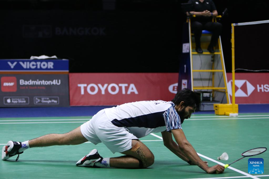 Kidambi Srikanth of India competes in the singles match against Jonatan Christie of Indonesia during the final match between Indonesia and India at Thomas Cup badminton tournament in Bangkok, Thailand, May 15, 2022. (Xinhua/Wang Teng)