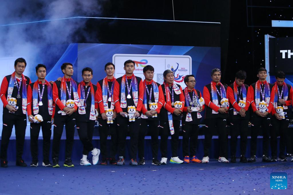 Members of team Indonesia attend the awarding ceremony after the final match between Indonesia and India at Thomas Cup badminton tournament in Bangkok, Thailand, May 15, 2022. (Xinhua/Wang Teng)