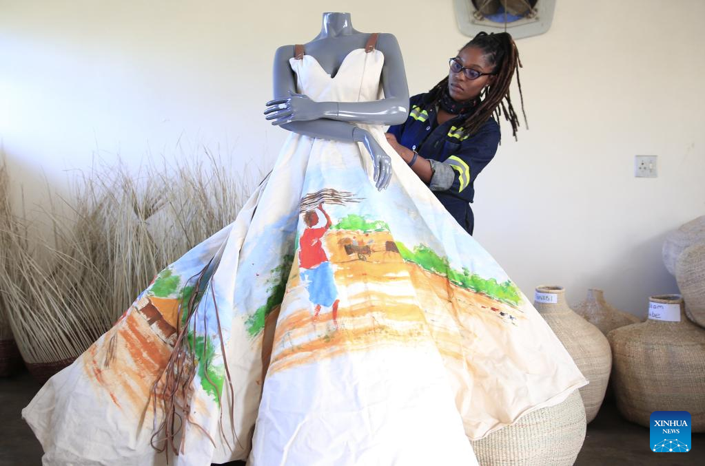 Nkanyeziyethu Malunga, a fashion designer, shows one of her works in Bulawayo, Zimbabwe, on April 26, 2022. (Photo by Shaun Jusa/Xinhua)