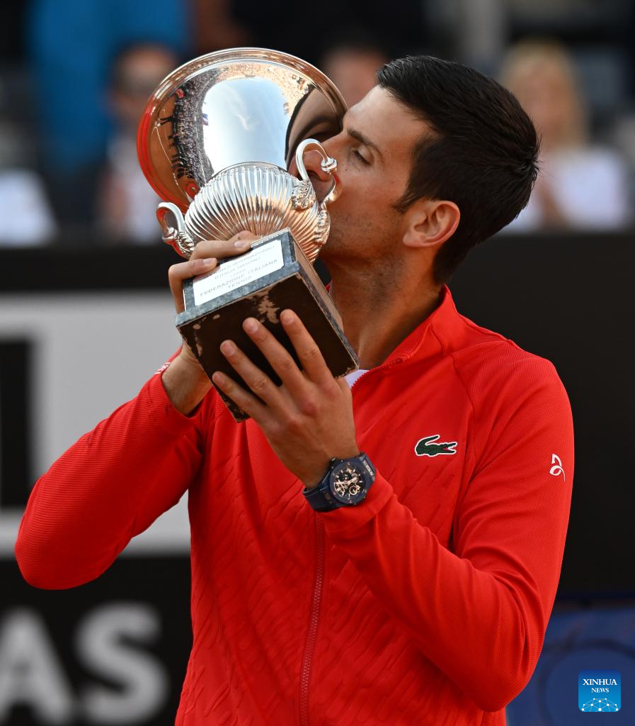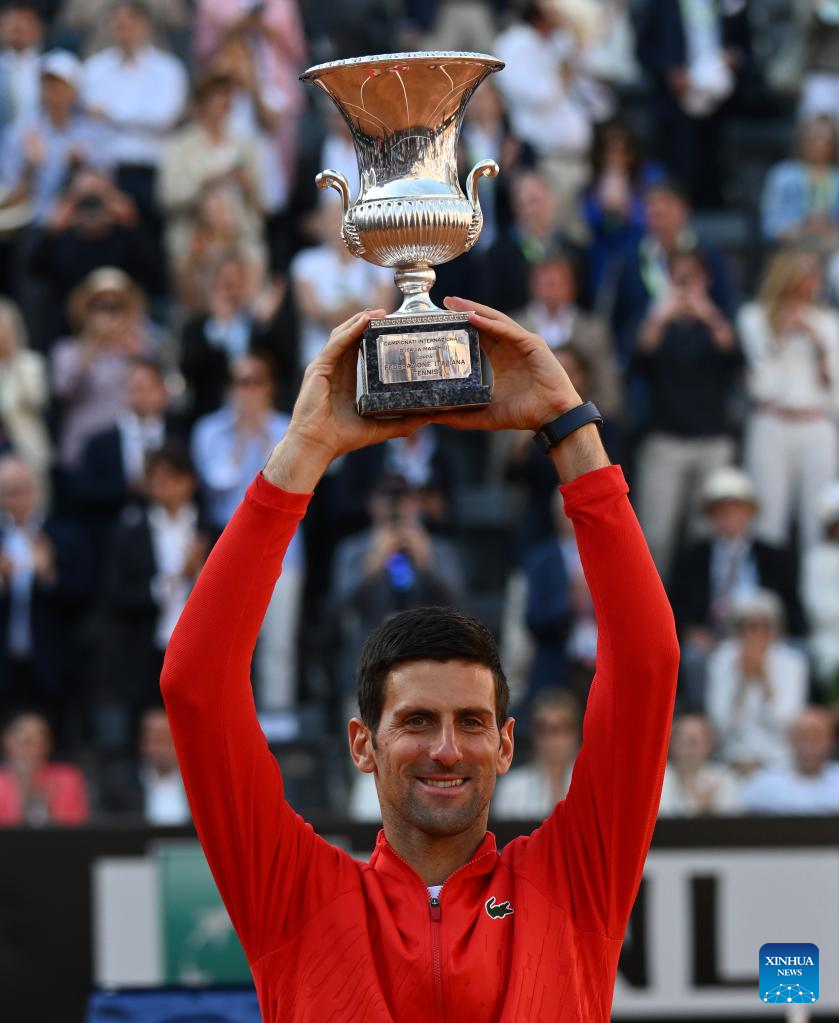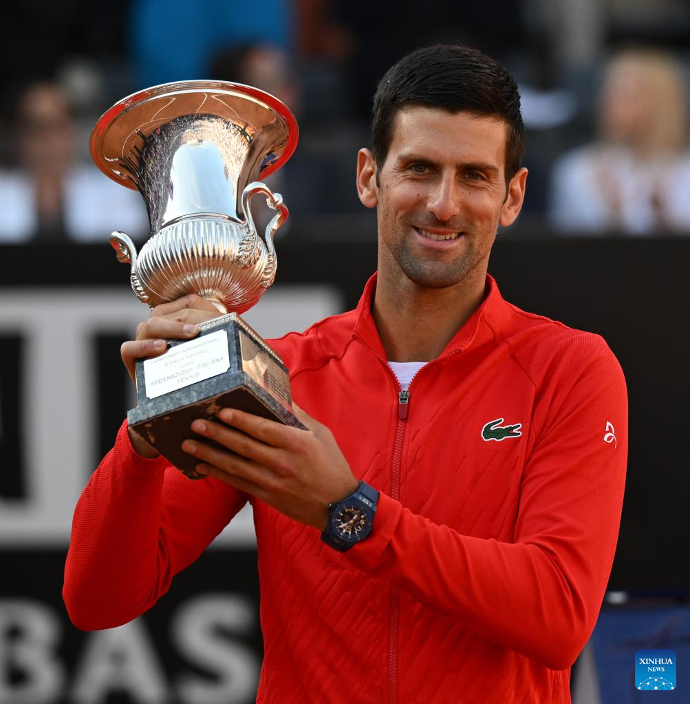 Novak Djokovic of Serbia holds the trophy during the awarding ceremony after the men's singles final match of Italian Open tennis tournament between Novak Djokovic of Serbia and Stefanos Tsitsipas of Greece in Rome, Italy, May 15, 2022. (Str/Xinhua)