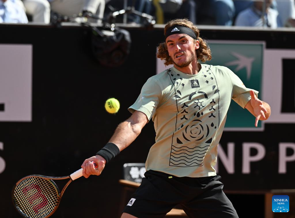 Stefanos Tsitsipas of Greece hits a return during the men's singles final match of Italian Open tennis tournament between Novak Djokovic of Serbia and Stefanos Tsitsipas of Greece in Rome, Italy, May 15, 2022. (Str/Xinhua)