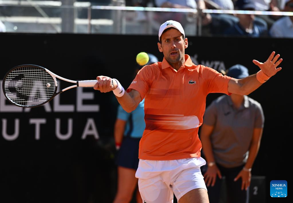 Novak Djokovic of Serbia hits a return during the men's singles final match of Italian Open tennis tournament between Novak Djokovic of Serbia and Stefanos Tsitsipas of Greece in Rome, Italy, May 15, 2022. (Str/Xinhua)