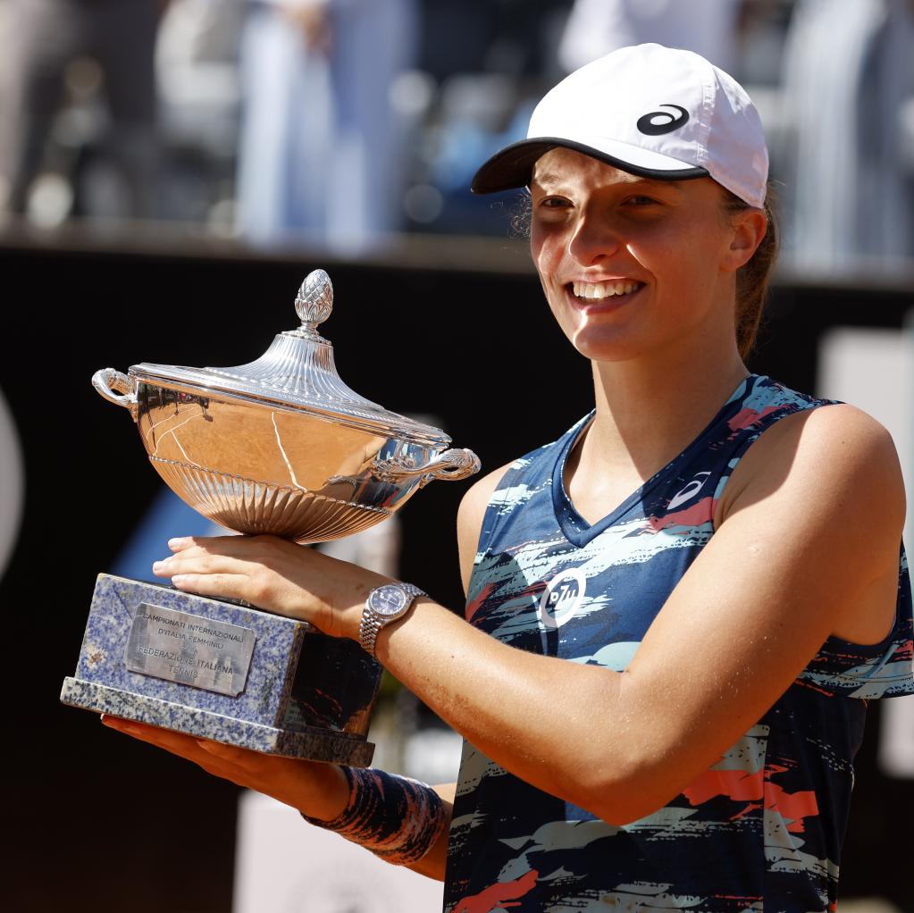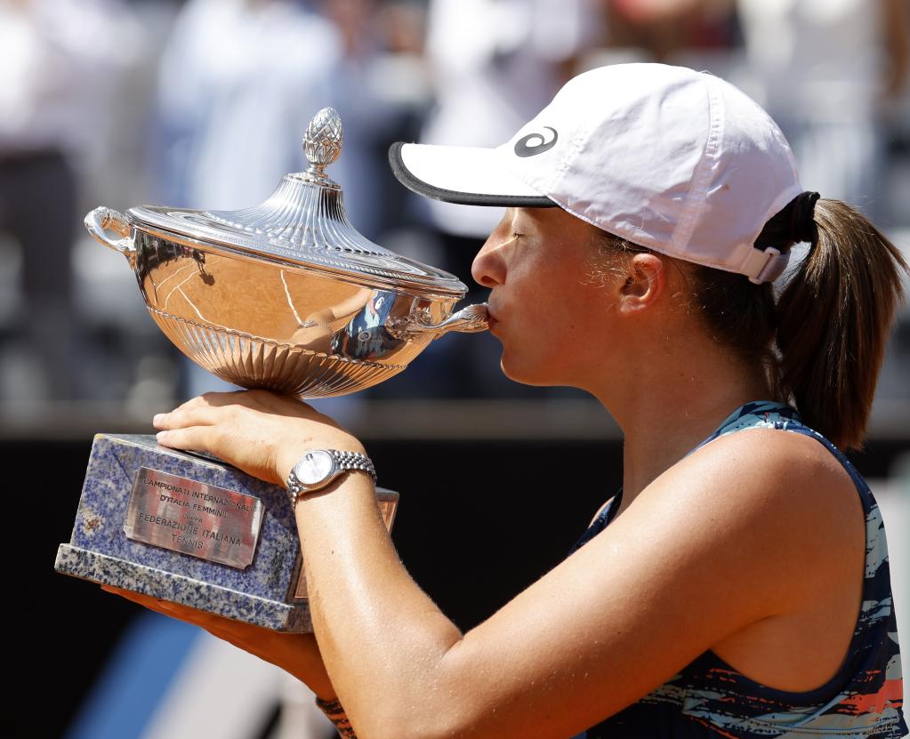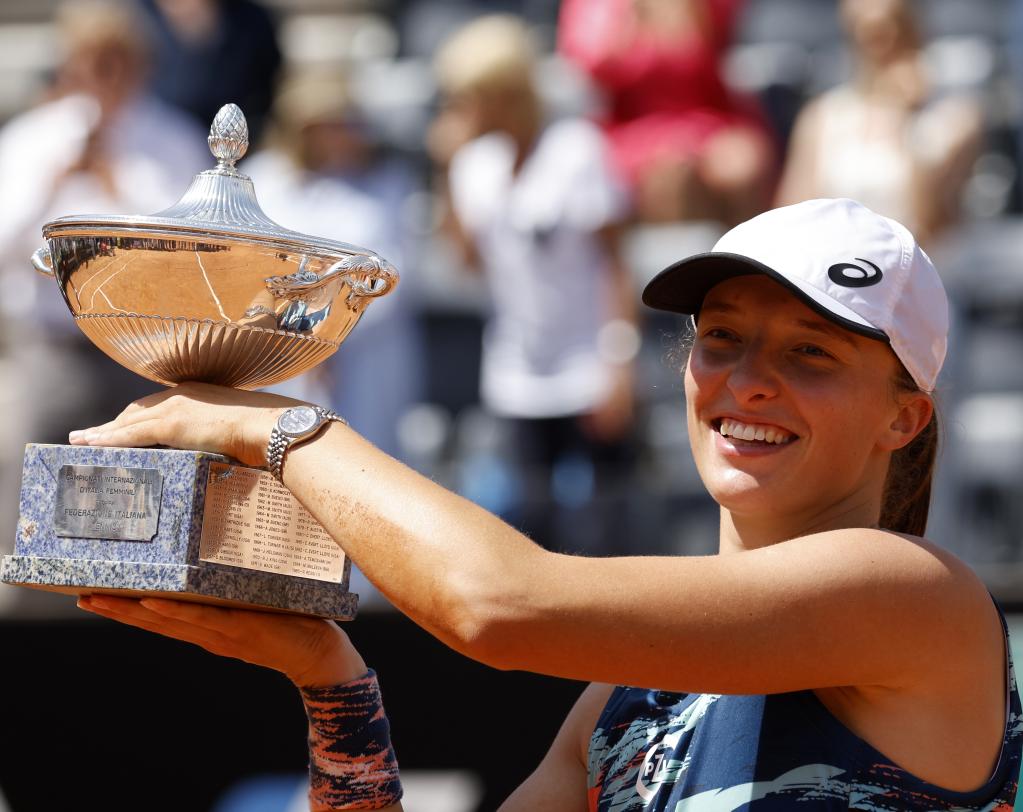Iga Swiatek of Poland holds the trophy during the awarding ceremony after the women's singles final match of Italian Open tennis tournament between Iga Swiatek of Poland and Ons Jabeur of Tunisia in Rome, Italy, May 15, 2022. (Str/Xinhua)