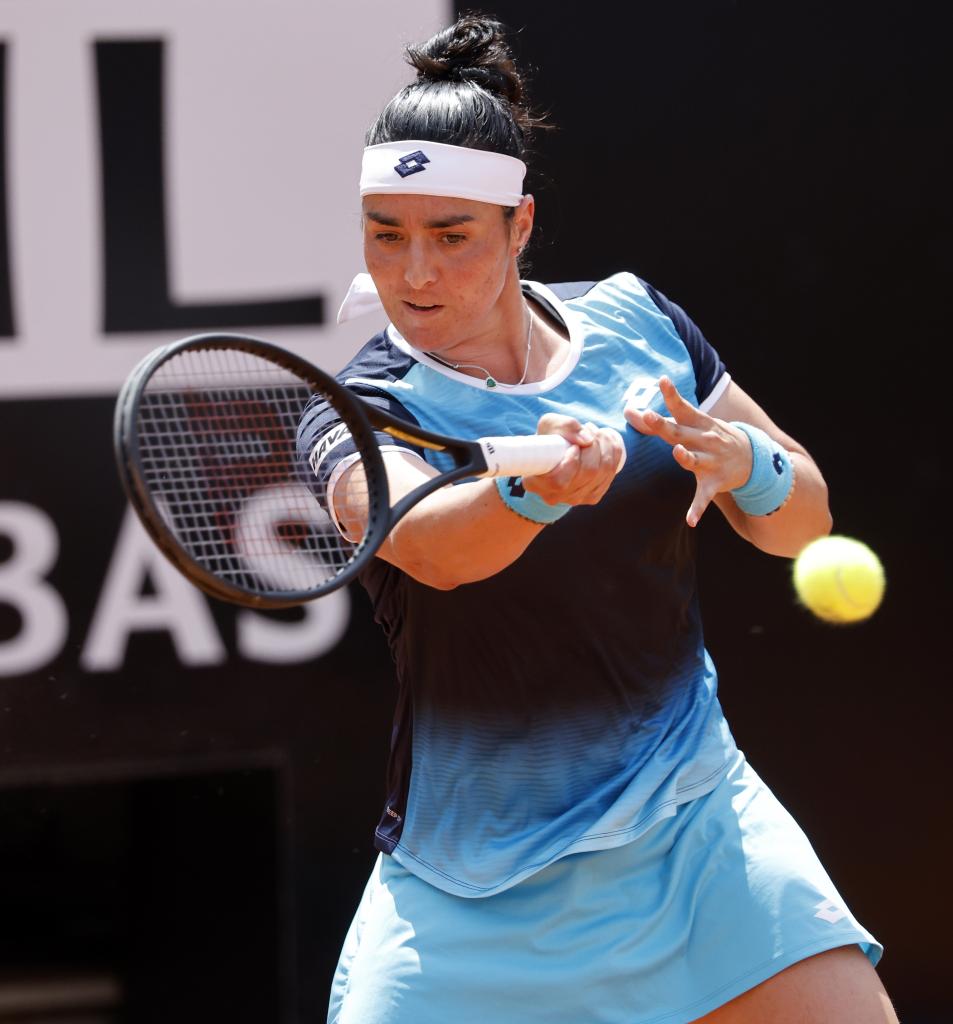 Ons Jabeur of Tunisia hits a return during the women's singles final match of Italian Open tennis tournament between Iga Swiatek of Poland and Ons Jabeur of Tunisia in Rome, Italy, May 15, 2022. (Str/Xinhua)