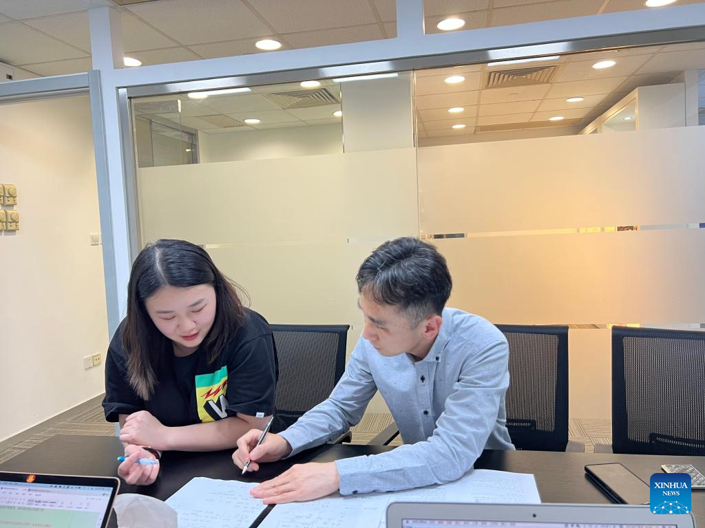 Lee Jong-hyeok (R), head of the Cheongju City Representative Office of the Republic of Korea (ROK) in Wuhan, writes in Chinese during an interview with Xinhua in Wuhan, central China's Hubei Province, April 28, 2022. (Xinhua/Deng Nan)