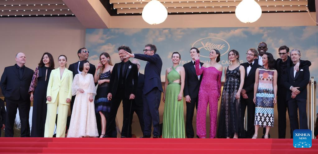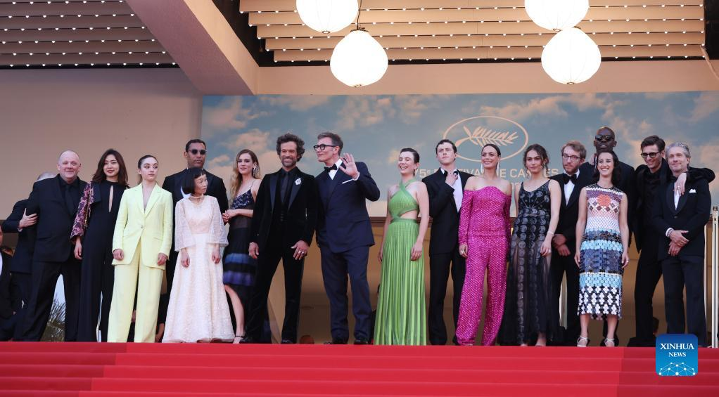 Cast members arrive to attend the screening of "Coupez!" (Final Cut) ahead of the opening ceremony of the 75th edition of the Cannes Film Festival in Cannes, southern France, on May 17, 2022. The 75th edition of the Cannes Film Festival kicked off here on Tuesday. (Xinhua/Gao Jing)