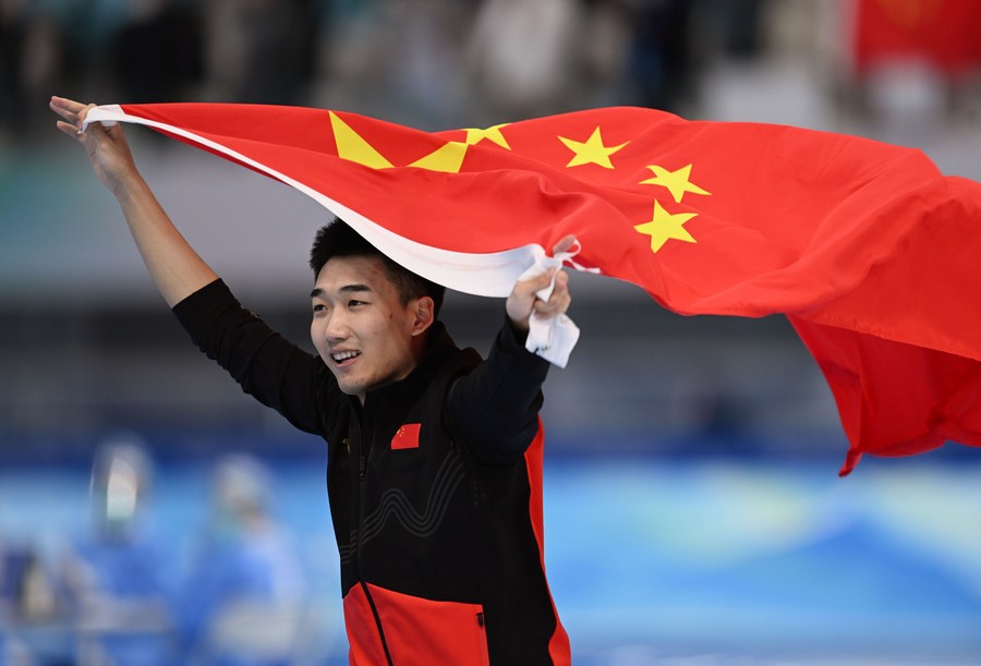 Gao Tingyu of China celebrates after winning the Beijing 2022 speed skating men's 500m event at the National Speed Skating Oval in Beijing, capital of China, Feb. 12, 2022. (Xinhua/Li Ga)