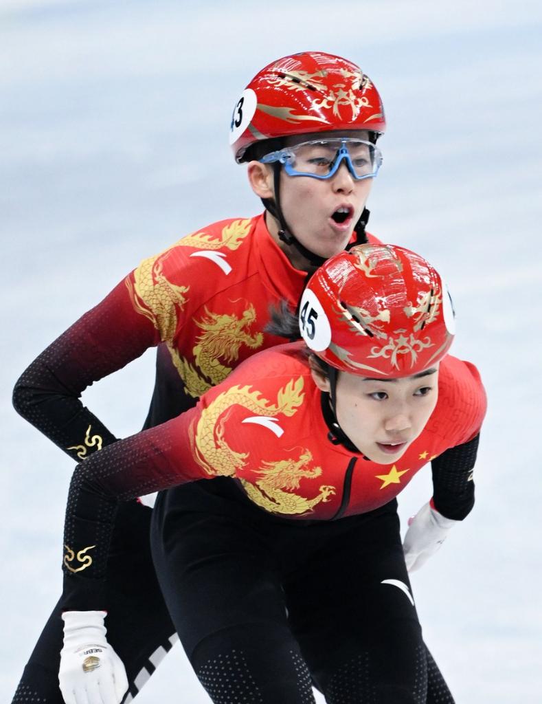 Fan Kexin (top) and Zhang Yuting of China compete during the Beijing 2022 women's 3,000m relay semifinal of short track speed skating at Capital Indoor Stadium in Beijing, capital of China, Feb. 9, 2022. (Xinhua/Li Yibo)