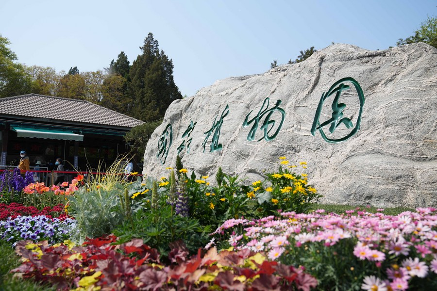 Photo taken on April 18, 2022 shows the entrance of the China National Botanical Garden in Beijing, capital of China. (Xinhua/Ju Huanzong)