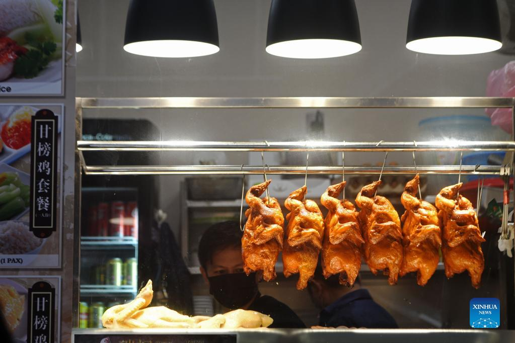 Photo shows a stall selling chicken rice in Singapore's city centre on May 24, 2022. The Ministry of Trade and Industry (MTI) and Monetary Authority of Singapore (MAS) announced on Monday that the MAS core inflation on a year-on-year basis rose to 3.3 percent in April from 2.9 percent in the previous month. Meanwhile, the CPI-All Items inflation remained unchanged at 5.4 percent year on year in April. (Photo by Then Chih Wey/Xinhua)