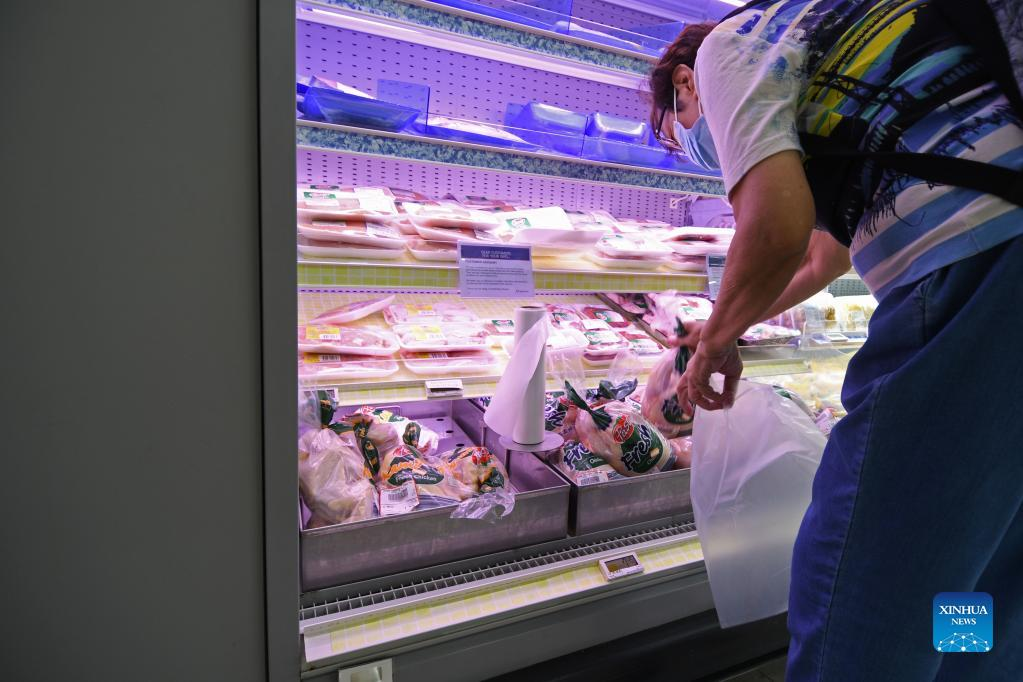 People buy chicken meat at a market in Singapore's city centre on May 24, 2022. The Ministry of Trade and Industry (MTI) and Monetary Authority of Singapore (MAS) announced on Monday that the MAS core inflation on a year-on-year basis rose to 3.3 percent in April from 2.9 percent in the previous month. Meanwhile, the CPI-All Items inflation remained unchanged at 5.4 percent year on year in April. (Photo by Then Chih Wey/Xinhua)