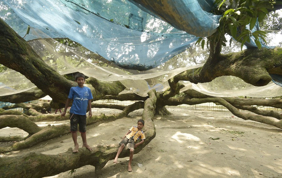 Children play under an old mango tree in Thakurgaon, Bangladesh, May 18, 2022. (Xinhua)