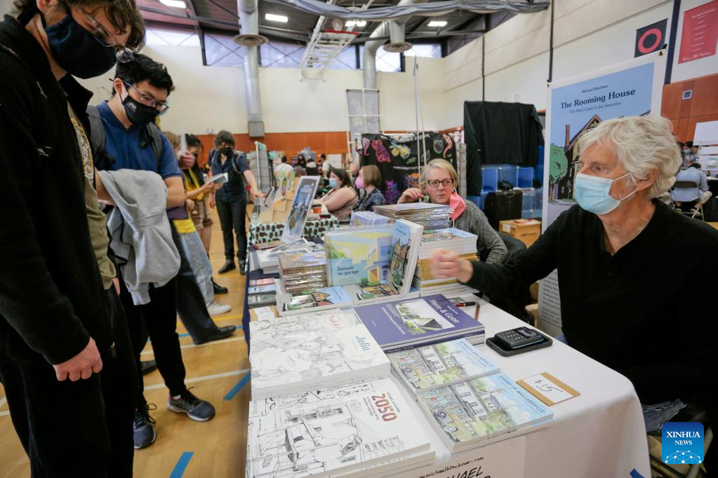 A comic artist talks with visitors at a booth during the Vancouver Comic Art Festival in Vancouver, British Columbia, Canada, on May 22, 2022. The Vancouver Comic Art Festival, an annual celebration of comics and graphic novels and their creators, features over one hundred of comic creators from around the world this year. (Photo by Liang Sen/Xinhua)