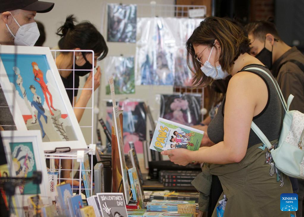 A visitor checks on different comic books at a booth during the Vancouver Comic Art Festival in Vancouver, British Columbia, Canada, on May 22, 2022. The Vancouver Comic Art Festival, an annual celebration of comics and graphic novels and their creators, features over one hundred of comic creators from around the world this year. (Photo by Liang Sen/Xinhua)