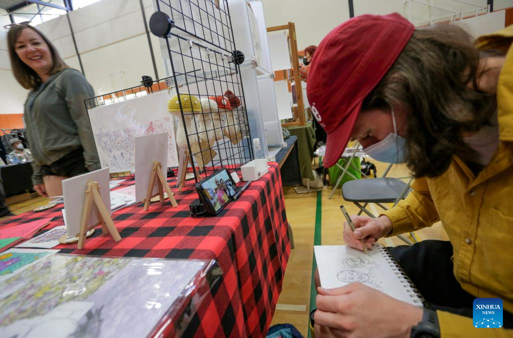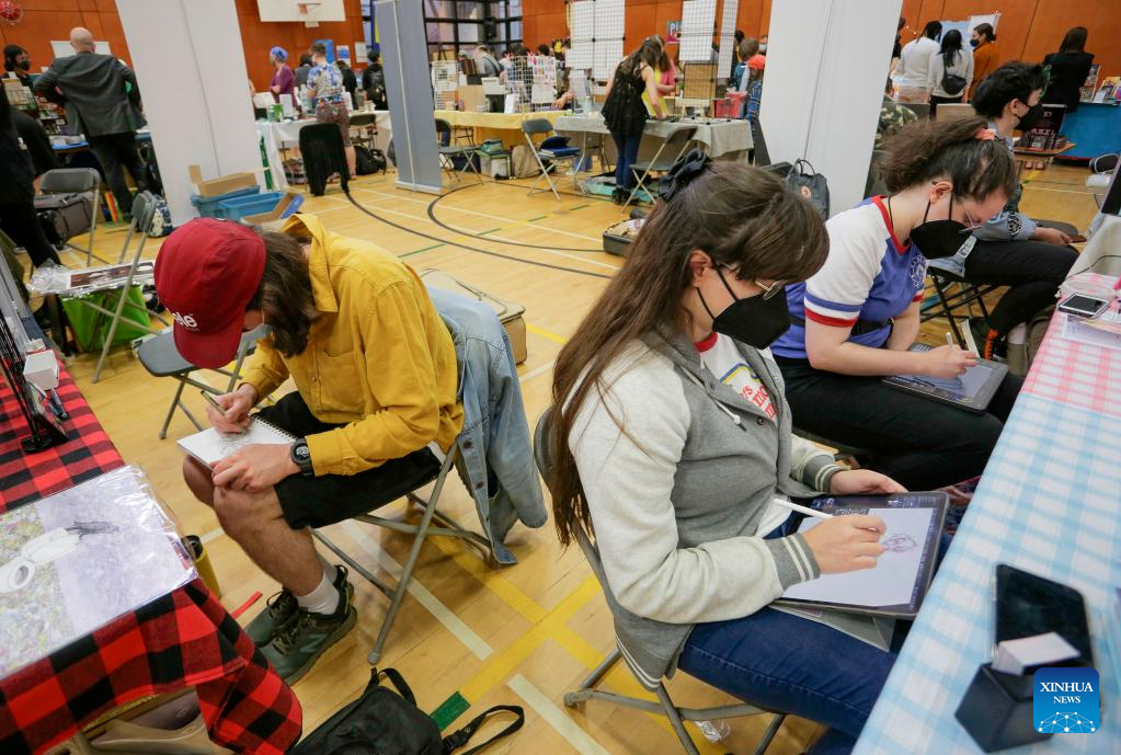 Comic artists create their comic artworks during the Vancouver Comic Art Festival in Vancouver, British Columbia, Canada, on May 22, 2022. The Vancouver Comic Art Festival, an annual celebration of comics and graphic novels and their creators, features over one hundred of comic creators from around the world this year. (Photo by Liang Sen/Xinhua)