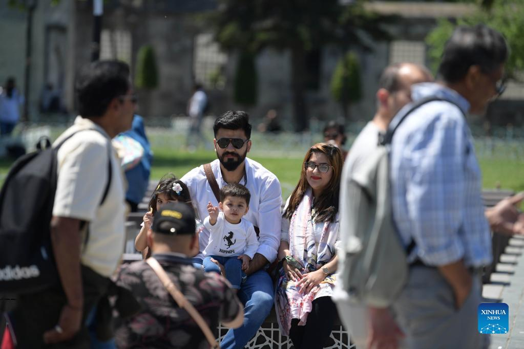 People visit Sultanahmet Square in Istanbul, Turkey, May 24, 2022. The foreign arrivals in Turkey surged by 225.6 percent year-on-year to 2.57 million in April, the official figures showed on Monday, as the country is trying to recover from the impact of COVID-19. (Xinhua/Shadati)