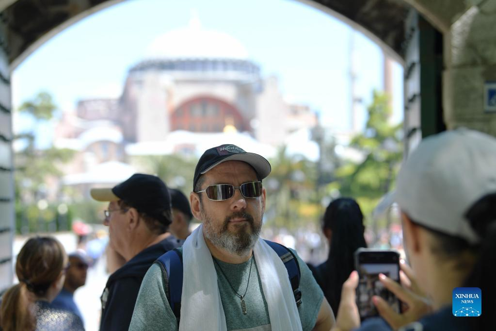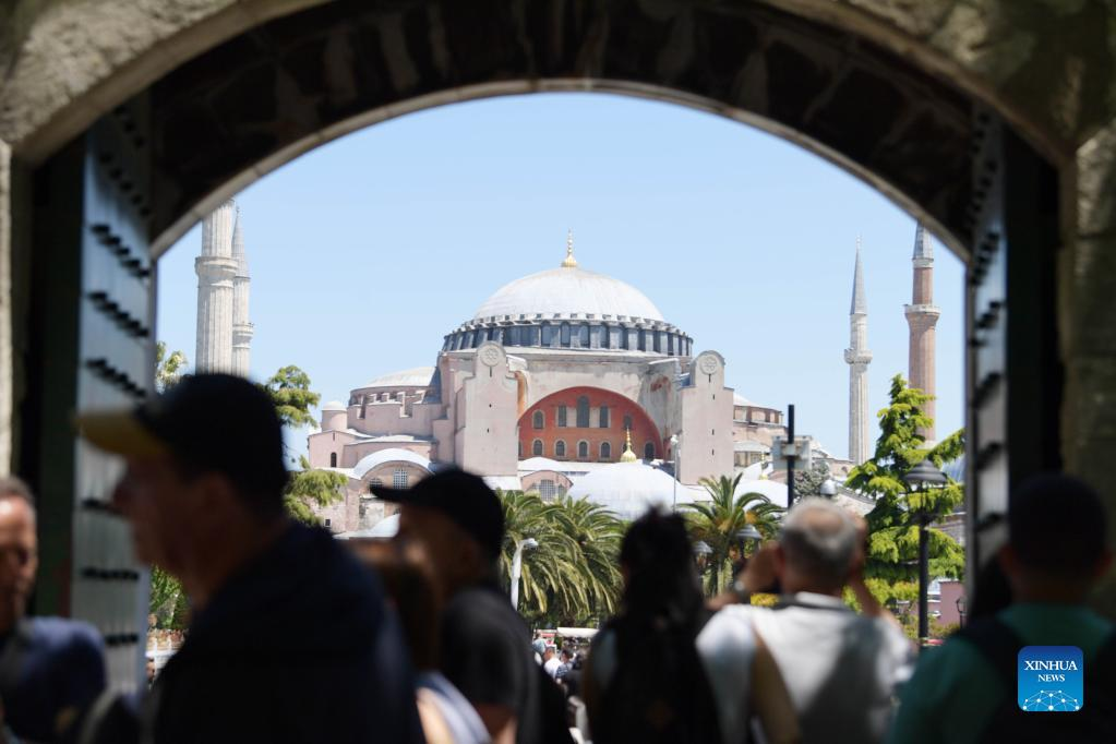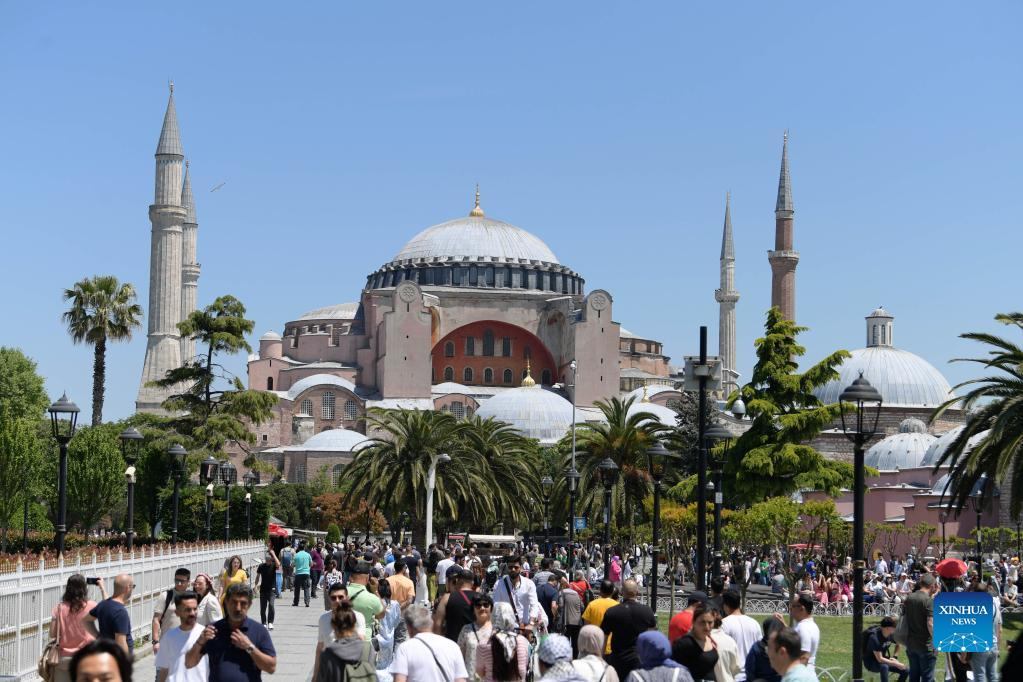 Tourists are seen near Hagia Sophia in Istanbul, Turkey, May 24, 2022. The foreign arrivals in Turkey surged by 225.6 percent year-on-year to 2.57 million in April, the official figures showed on Monday, as the country is trying to recover from the impact of COVID-19. (Xinhua/Shadati)