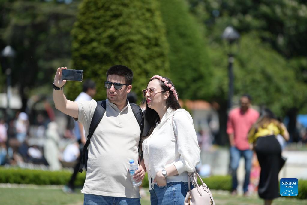 People take a selfie at Sultanahmet Square in Istanbul, Turkey, May 24, 2022. The foreign arrivals in Turkey surged by 225.6 percent year-on-year to 2.57 million in April, the official figures showed on Monday, as the country is trying to recover from the impact of COVID-19. (Xinhua/Shadati)