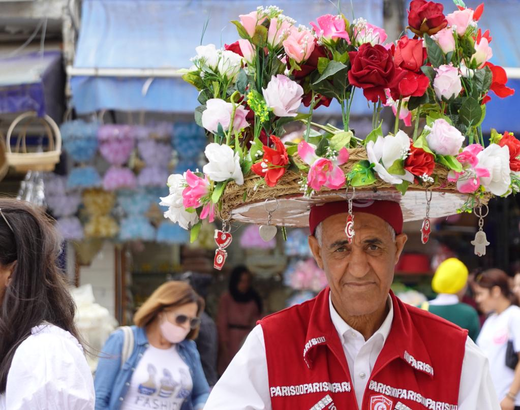 A man wearing various plastic flowers on his head is pictured in the Medina of Tunis, Tunisia, May 27, 2022.(Xinhua/Xu Supei)