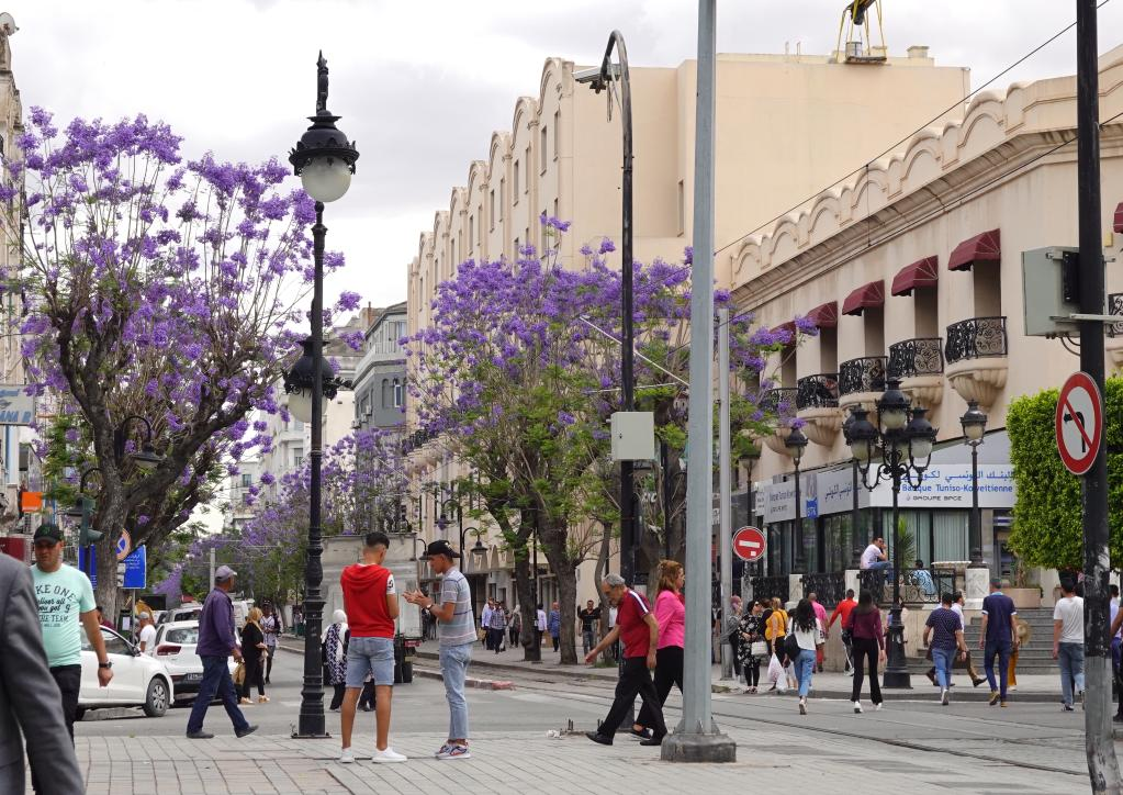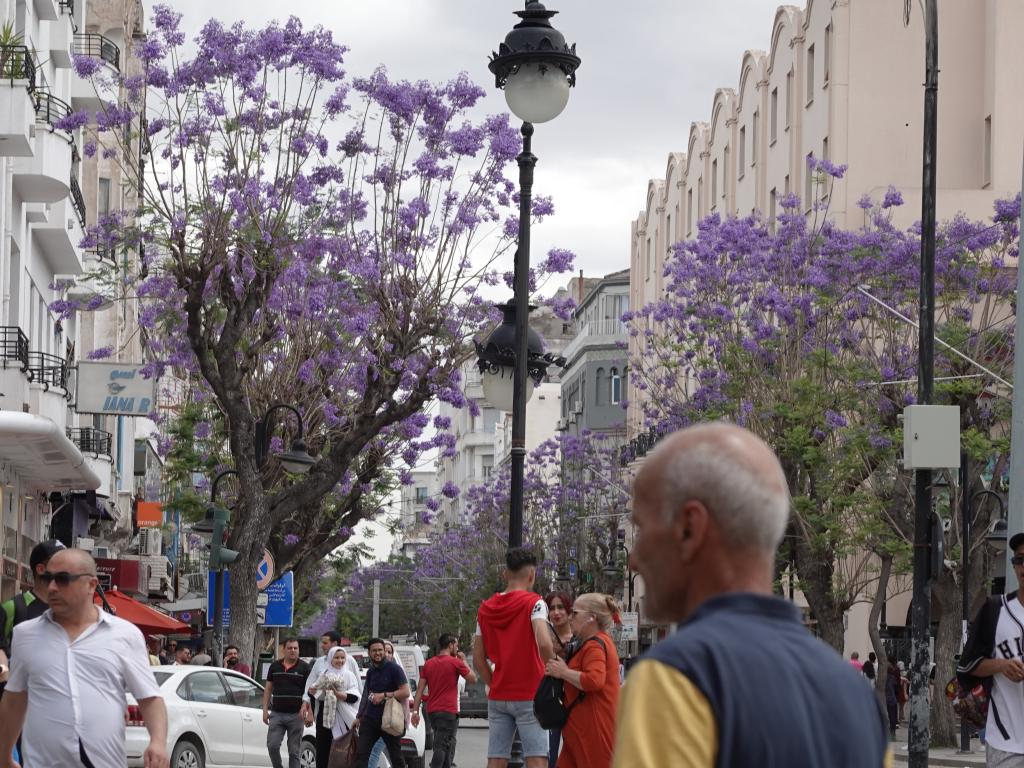 People walk on the street flanked by Jacaranda trees in the Medina of Tunis, Tunisia, May 27, 2022.(Xinhua/Xu Supei)