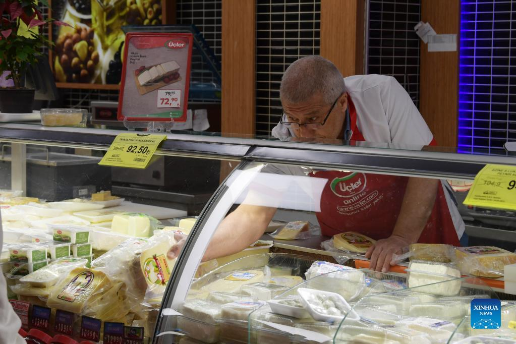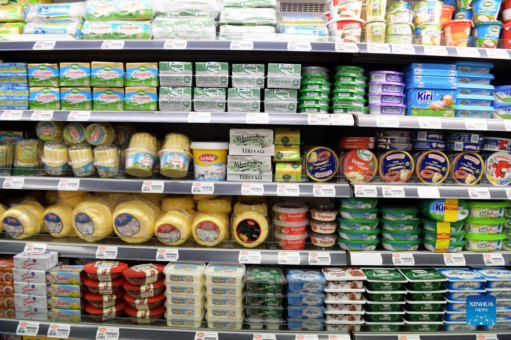 Photo taken on May 26, 2022 shows a dairy products booth at a supermarket in Istanbul, Turkey. Turkey's annual inflation jumped to 69.97 percent in April, reaching a two-decade high, the Turkish Statistical Institute has announced on May 5.