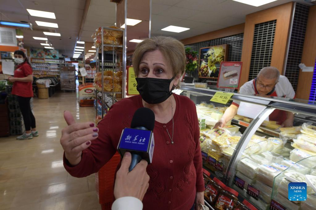 Sevda Alkin, a customer, speaks to Xinhua reporter at a supermarket in Istanbul, Turkey, May 26, 2022. The frequenter of the market intended to buy a couple of bottles of milk for her two grandchildren, but she abandoned the plan after seeing the prices of the chosen brand is 22 liras, up from 15 liras a month ago. A supermarket in Istanbul, once thronged with shoppers for a great variety of goods, is now completely desolated as inflation drove the prices out of reach. TO GO WITH "Feature: Turkish supermarket deserted amid ever-increasing food prices" (Xinhua/Shadati)
