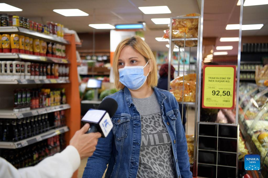 A customer speaks to Xinhua reporter at a supermarket in Istanbul, Turkey, May 26, 2022. A supermarket in Istanbul, once thronged with shoppers for a great variety of goods, is now completely desolated as inflation drove the prices out of reach. TO GO WITH "Feature: Turkish supermarket deserted amid ever-increasing food prices" (Xinhua/Shadati)
