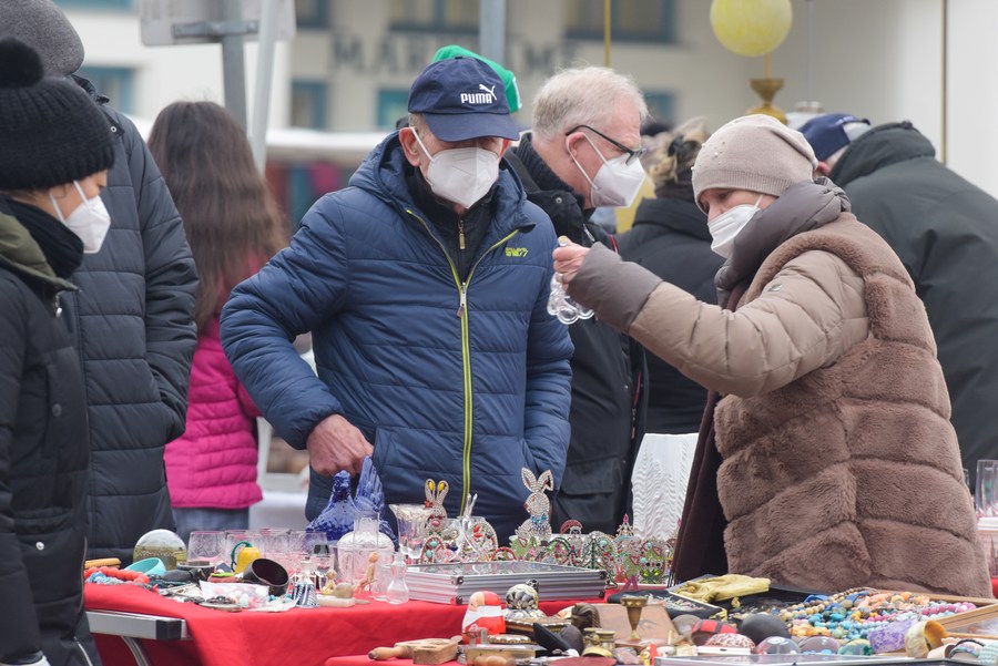 Customers select goods at the flea market Naschmarkt in Vienna, Austria, Feb. 20, 2021. (Xinhua/Guo Chen)■