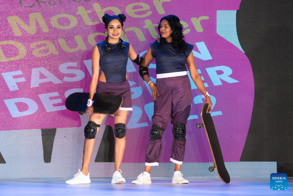 Models present creations during the Mother Daughter fashion show in Colombo, Sri Lanka, on May 29, 2022. The highlight of the show is that the designs are modeled by real mother-daughter duos. (Xinhua/Tang Lu)