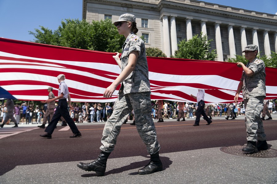 People take part in the Memorial Day parade in Washington, D.C., the United States, on May 30, 2022. (Xinhua/Liu Jie)