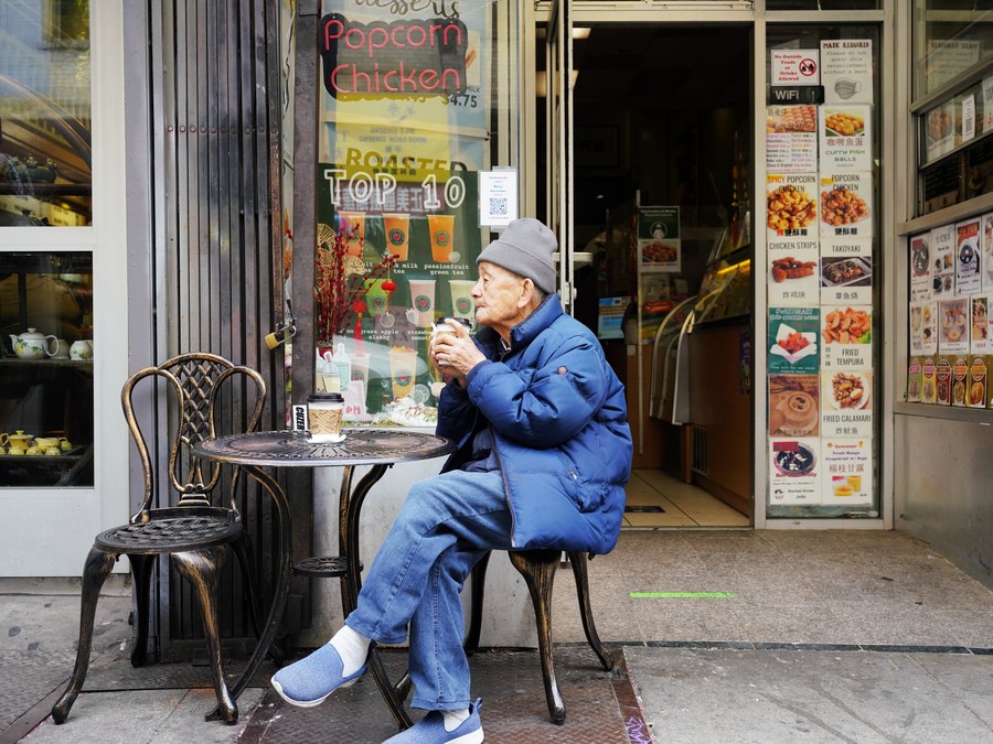 A man sits in front of a milk tea shop in the China Town of San Francisco, California, the United States, March 19, 2022. (Xinhua/Wu Xiaoling)