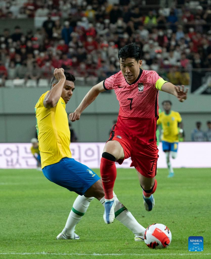 South Korea's Son Heung-min (front R) breaks through during a friendly match between Brazil and South Korea in Seoul, South Korea, June 2, 2022. (Photo by James Lee/Xinhua)
