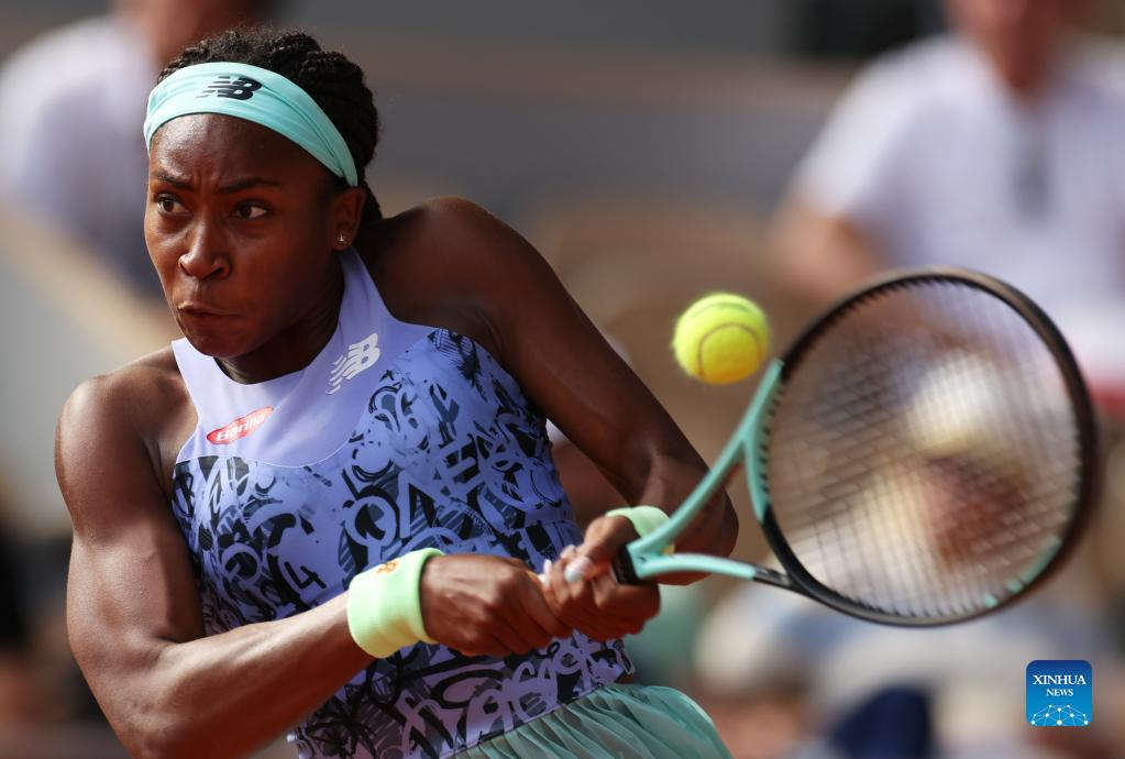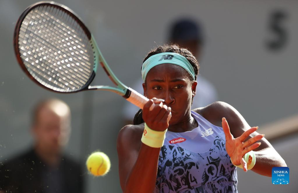 Coco Gauff of the United States hits a return during the women's singles semifinal against Martina Trevisan of Italy at the French Open tennis tournament at Roland Garros in Paris, France, June 2, 2022. (Xinhua/Gao Jing)
