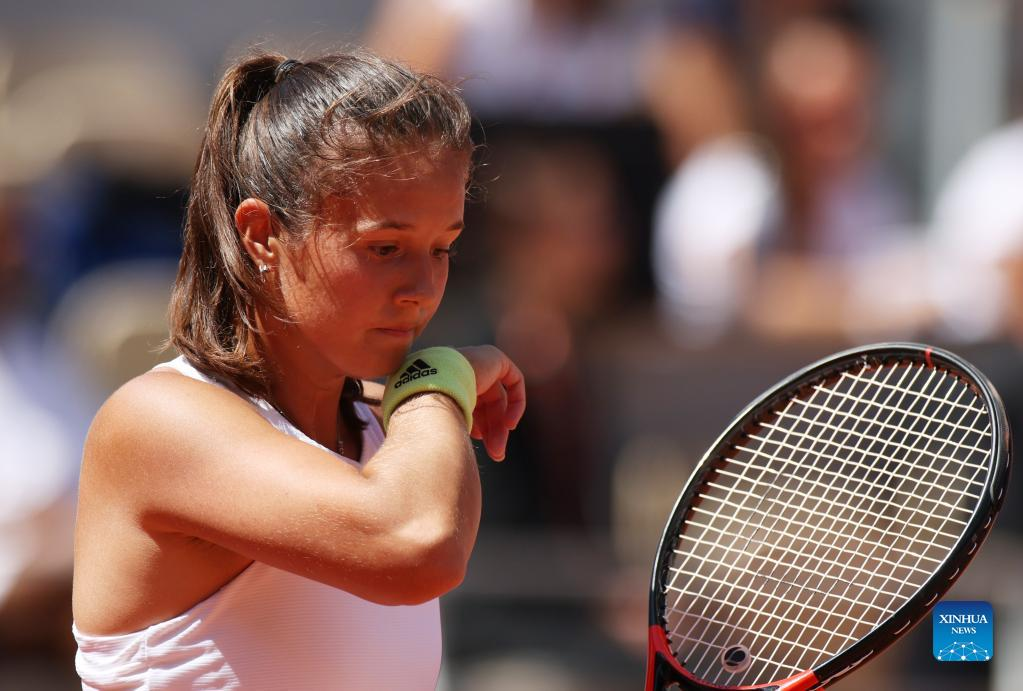 Daria Kasatkina reacts during the women's singles semifinal between Iga Swiatek of Poland and Daria Kasatkina of Russia at the French Open tennis tournament at Roland Garros in Paris, France, June 2, 2022. (Xinhua/Gao Jing)