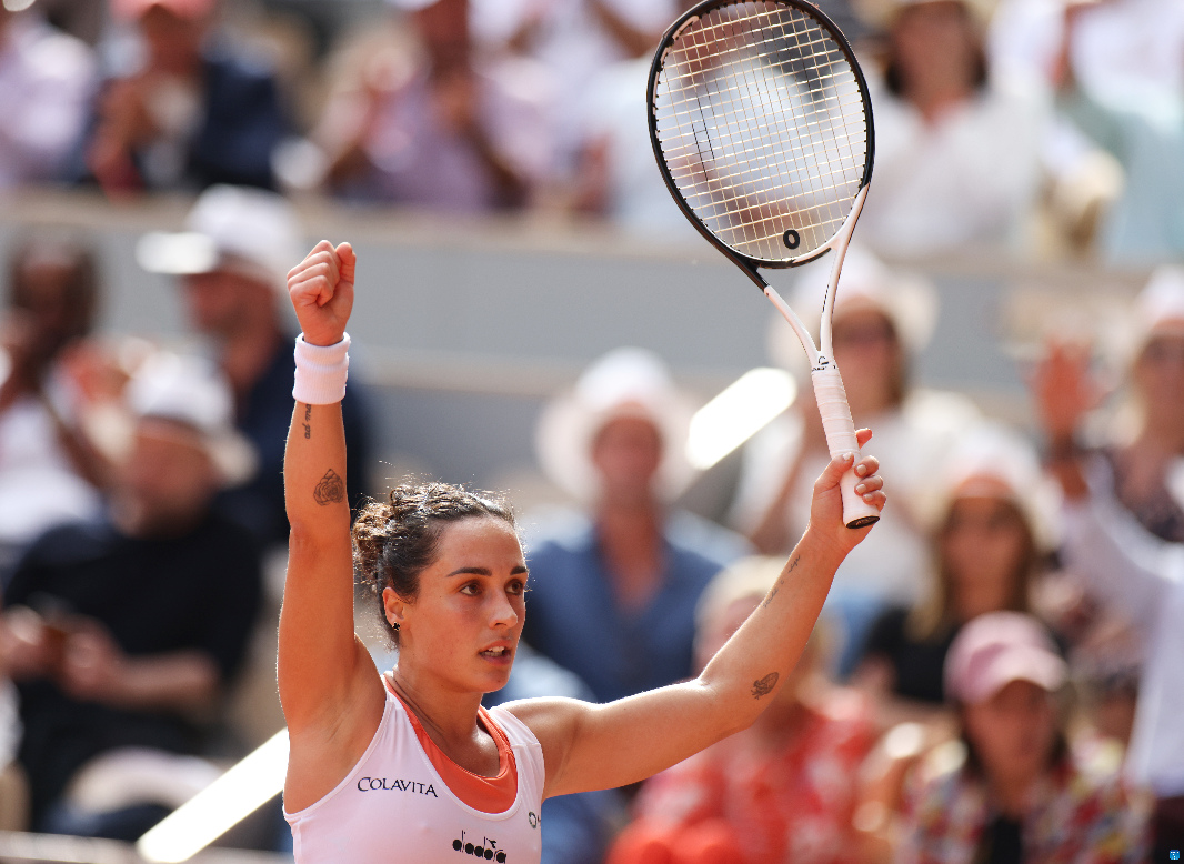 Martina Trevisan of Italy reacts during the women's singles semifinal against Coco Gauff of the United States at the French Open tennis tournament at Roland Garros in Paris, France, June 2, 2022. (Xinhua/Gao Jing)