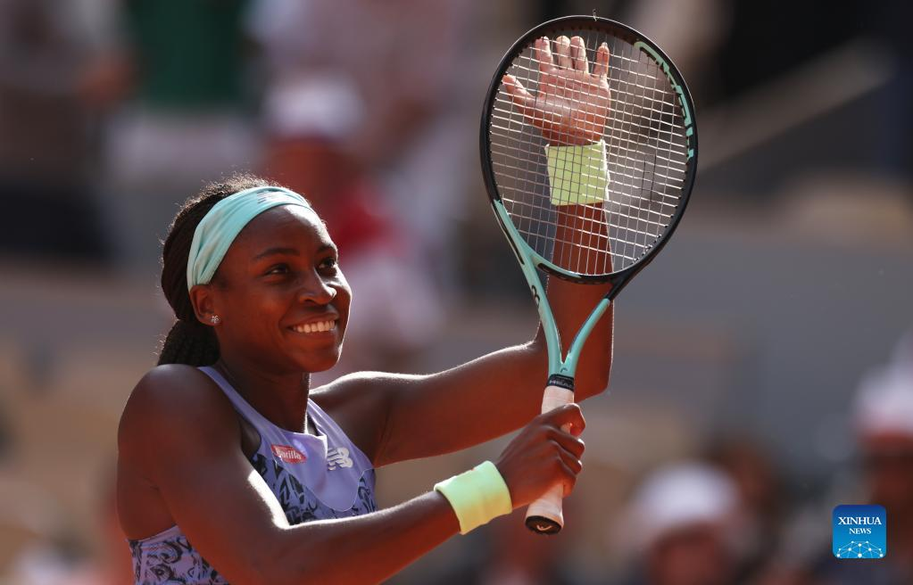Coco Gauff of the United States celebrates the victory after the women's singles semifinal against Martina Trevisan of Italy at the French Open tennis tournament at Roland Garros in Paris, France, June 2, 2022. (Xinhua/Gao Jing)