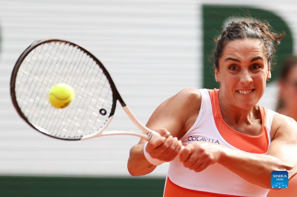 Martina Trevisan of Italy hits a return during the women's singles semifinal against Coco Gauff of the United States at the French Open tennis tournament at Roland Garros in Paris, France, June 2, 2022. (Xinhua/Gao Jing)