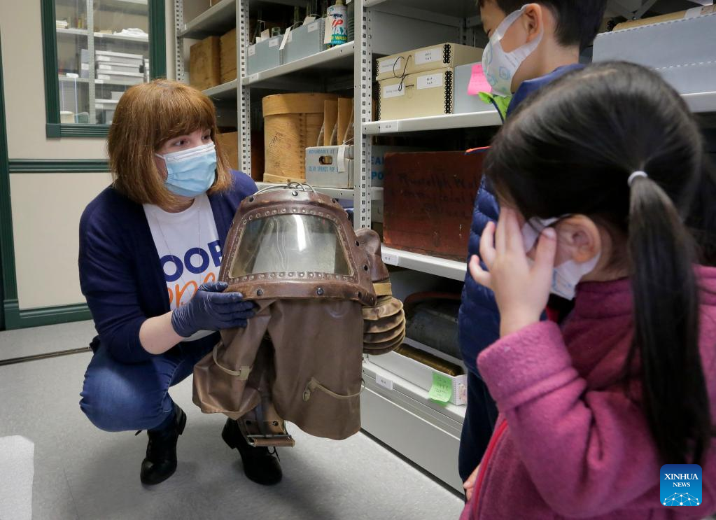 A staff member shows a gas mask at Richmond Museum's artifact storage warehouse during the Doors Open Richmond event in Richmond, British Columbia, Canada, on June 4, 2022. Richmond Museum's artifact storage warehouse, a place where the city stores historical artifact collections, offered the public an opportunity to have a behind-the-scene tour during the Doors Open Richmond event. (Photo by Liang Sen/Xinhua)
