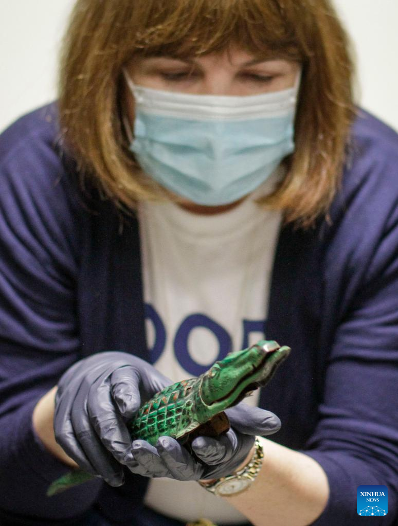 A staff member shows a metal toy made in 1930s at Richmond Museum's artifact storage warehouse during the Doors Open Richmond event in Richmond, British Columbia, Canada, on June 4, 2022. Richmond Museum's artifact storage warehouse, a place where the city stores historical artifact collections, offered the public an opportunity to have a behind-the-scene tour during the Doors Open Richmond event. (Photo by Liang Sen/Xinhua)
